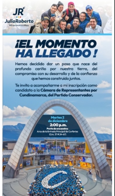 Por eso quiero invitarte a que nos acompañes en el acto de inscripción a la Cámara de Representantes por Cundinamarca». JULIO ROBERTO SALAZAR PERDOMO